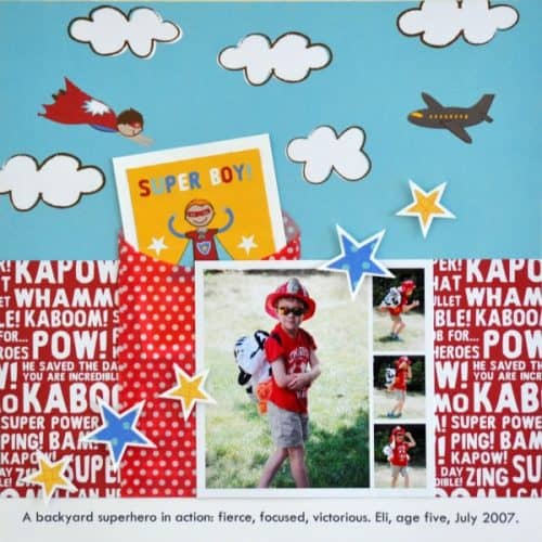 Wendy Sue Anderson and Vivian Masket designed some adorable page layouts with the Superhero Collection! Seriously, so so cute! Wendy Sue’s design with the three brothers featured above, melted my heart. That would be perfect framed on the wall.